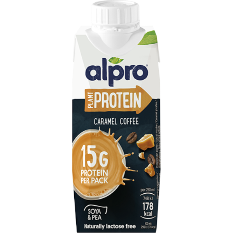 Високопротеинова соева напитка с аромат на карамел и кафе, с добавени калций и витамини.