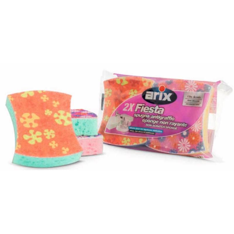 Гъба Arix ФИБРО ДЕЛИКАТНА ФИЕСТА 2бр Синтетична гъба с декорирани влакна без драскотини. За дълбоко, но безопасно почистване на антиприлепни тигани, порцелани, чаши, мивки в кухнята и премахване на варовик от елементите на банята (мивки, душ кабина, плочки). Формата на сцепление за лесно почистване и усмихнатите, украсени влакна спомагат за ежедневното ви настроение при почистване!