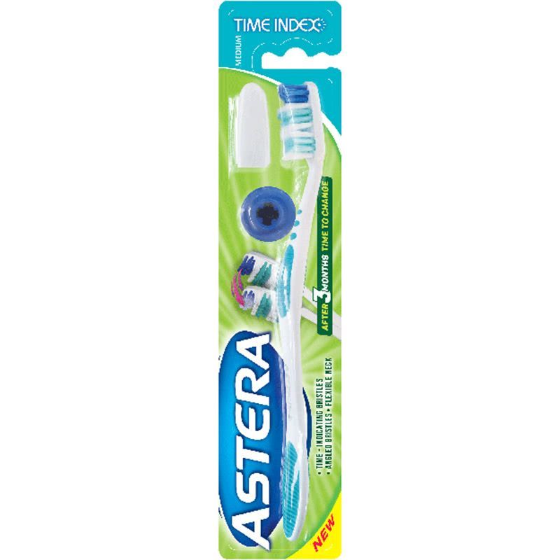 Влакна индикиращи момента на смяна на четката за зъби. Препоръчително е четката за зъби да се сменя на всеки 3 месеца или след настинка. Astera Time Index напомня за това, когато сините снопчета избледнеят до бяло.