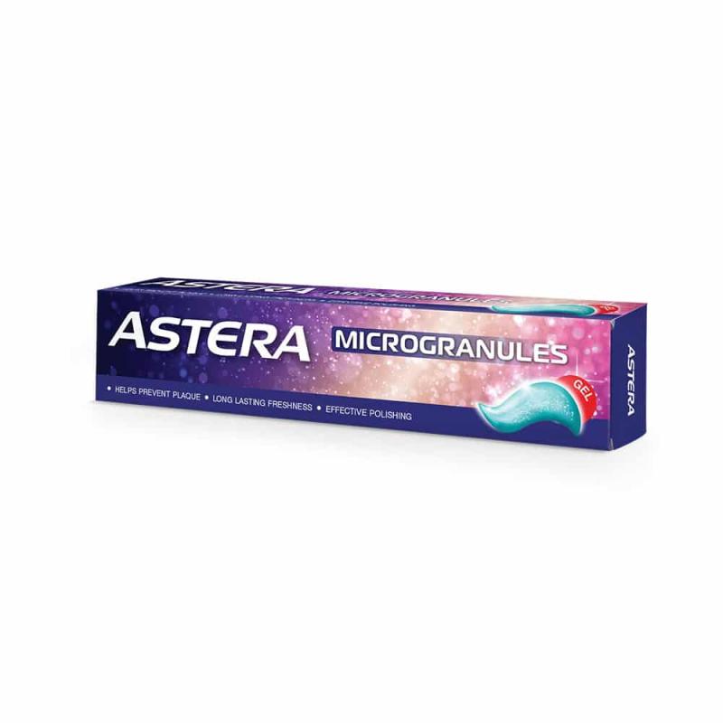 Състав:SORBITOL, HYDRATED SILICA, GLYCERIN, AQUA, PEG - 8, SODIUM LAURYL SULFATE, AROMA, LIMONENE, XANTHAN GUM, CARRAGEENAN, CELLULOSE GUM, SODIUM FLUORIDE, SODIUM SACCHARIN, SODIUM METHYLPARABEN, TRICLOSAN, CI 42090.Astera Xtreme Microgranules e паста за зъби с микрогранули за ефикасно почистване на зъбната плака и междузъбните пространства. Астера Екстрийм Микрогранули премахва замърсяванията от зъбния емайл с лекота, без да го наранява. Дарява ви с усещане за оптимална хигиена и свежест.