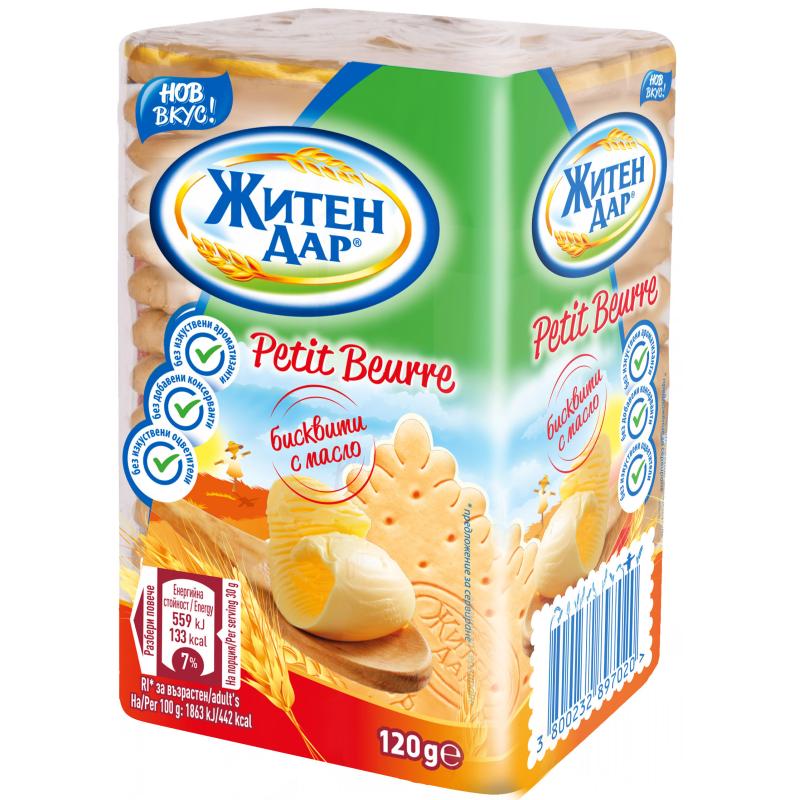 Съставки: пшеничено брашно, захар, палмово масло, глюкозен сироп, краве масло 1%, набухватели (амониев бикарбонат, натриев бикарбонат), естествен ароматизант на краве масло (мляко), естествен ароматизант. Съдържание: Може да съдържа фъстъци и ядки.