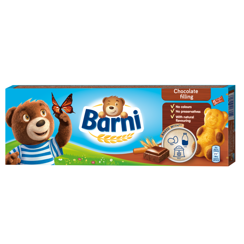 Съставки: ПШЕНИЧНО брашно, глюкозо-фруктозен сироп, ЯЙЦА 12,3% , захар, рапично масло, шоколад 6% [какаова маса, захар, нискомаслено какао на прах, емулгатор (СОЕВ лецитин)], стабилизатор (глицерол), обезмаслено МЛЯКО на прах (3,4%)*, пълномаслено МЛЯКО на прах (2,2%)*, ПШЕНИЧЕНО нишесте, набухватели (динатриев дифосфат, натриев хидроген карбонат), емулгатори (естери на млечната киселина с моно- и диглицериди на мастни киселини, полиглицеролови естери на мастни киселини, СОЕВ лецитин), сол, нискомаслено какао на прах, ароматизанти. * Еквивалент на 53% прясно мляко. Хранителна стойност за 100 г продукт: Енергийна стойност: 1691 kJ / 402 kcal; Мазнини: 16 г, от които наситени мастни киселини 3,1 г; Въглехидрати: 58 г, от които захари: 29 г; Белтъчини: 6 г; Сол 0,83 г. МОЖЕ ДА ИМА ЯДКИ.