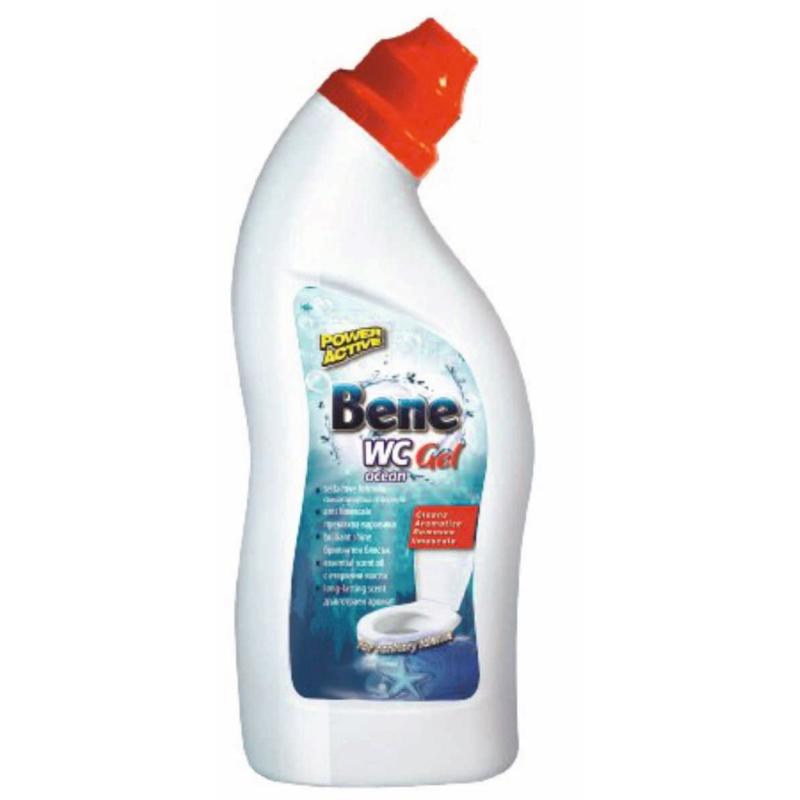 Бене WC гел е ароматизиран гел за почистване на санитарен фаянс. Силната му формула, състояща се от няколко вида активни вещества и киселина, гарантират бързо отстраняване на отлагания от всякакъв характер, включително на варовик и калциев карбонат (бели петна). Формата на бутилката позволява препарата да се нанася под ръба на тоалетната чиния и под мивките, където се отлагат най-големите замърсявания. След употреба фаянсовите и хромирани повърхности възвръщат своя естествен блясък и остават приятно ароматизирани. Не съдържа хлор.