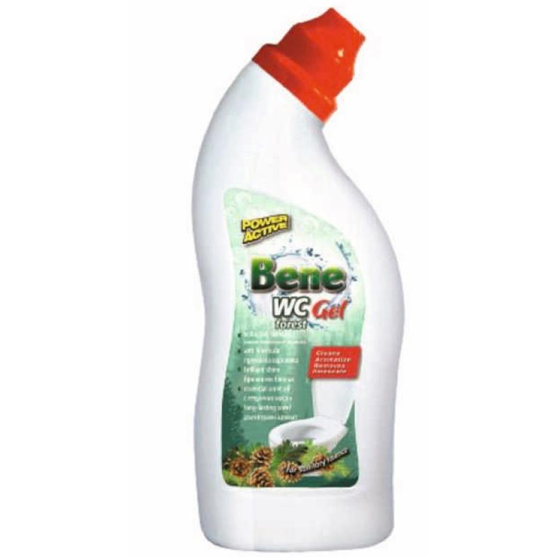 Бене WC гел е ароматизиран гел за почистване на санитарен фаянс. Силната му формула, състояща се от няколко вида активни вещества и киселина, гарантират бързо отстраняване на отлагания от всякакъв характер, включително на варовик и калциев карбонат (бели петна). Формата на бутилката позволява препарата да се нанася под ръба на тоалетната чиния и под мивките, където се отлагат най-големите замърсявания. След употреба фаянсовите и хромирани повърхности възвръщат своя естествен блясък и остават приятно ароматизирани. Не съдържа хлор.