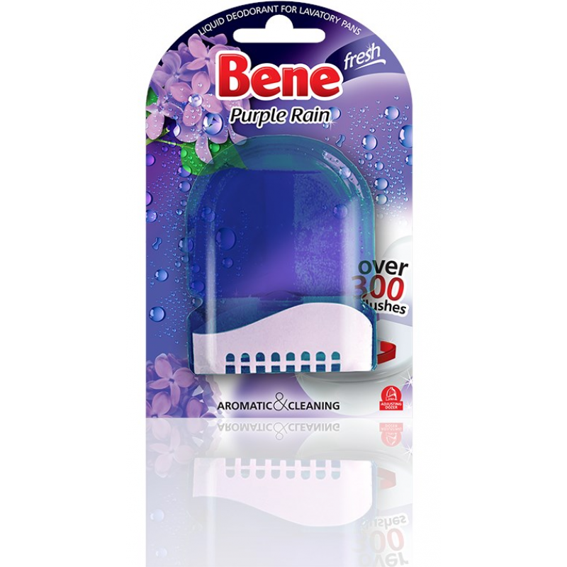 Бене Фреш е течен ароматизатор за тоалетни чинии. Перфектно отстранява замърсяването и отлаганията от урина и карбонати по фаянса на тоалетната. Балансираната му формула дезинфекцира и измива отлично с над 10 дни трайност на действието, на изключително изгодна цена. В помещението остава траен фин аромат. При употреба, не премахвайте предпазната тапичка от дъното на пълнителя.