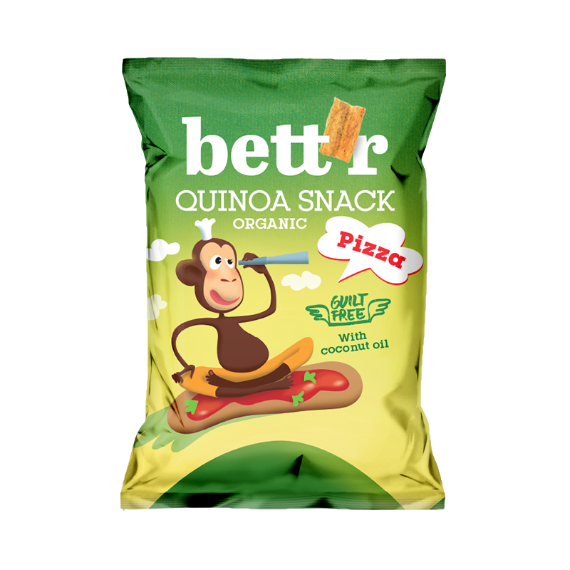 Киноа снакс одобрен от майки и деца: – Чуден вкус и хрупкава текстура, благодарение на царевичното брашно с добавена супер-киноа – Добра алтернатива на пшеничните снаксове – С естествени подправки за неустоим вкус пица Съставки: царевичен грис*, брашно от киноа* 31%, кокосово масло без аромат* 15%, микс от подправки* (домати на прах, червен пипер, босилек, риган) 4%, сол 1% *от био земеделие