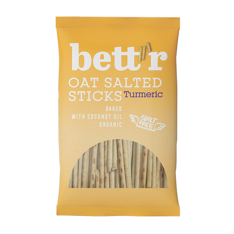 Овесени солети, направени хрупкави и вкусни с квас и смес от био овесено и пшенично брашно. Наслади се на финия вкус на куркума и направи твоето похапване Bett`r. Съставки: Овесено брашно* (44%), пшенично брашно*, кокосово масло без аромат*, пшеничен квас*, морска сол, куркума* (0,3%) *Съставки от сертифицирано био земеделие