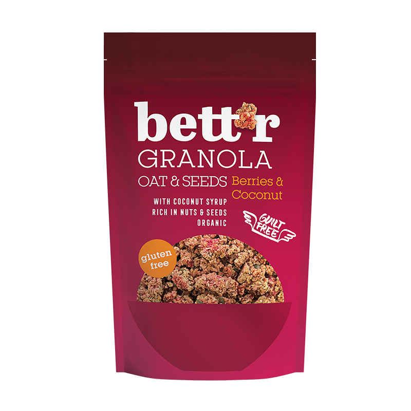 Съставки: Безглутенови овесени ядки* (33%), оризов сироп*, бадеми* (8%), кокосов сироп* (5%), кокосово масло* (5%), тиквено семе*(5%), слънчогледово семе* (5%), сусам* (4%), фурми*, кокосов чипс* (4%), череши* (4%), ленено семе* (3%), кайсии*, сол.
