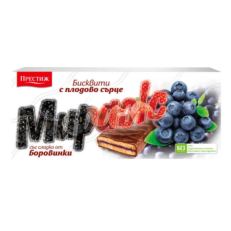 Съставки: ПШЕНИЧНО брашно, сладко от боровинка 23%(боровинки 8%, глюкозо-фруктозен сироп, захар, желиращ агент-пектин, регулатор на киселинността-лимонена киселина, консервант - калиев сорбат, ароматизанти, натурални оцветители- антоцианини, нехидрогенирани растителни мазнини(мазнини-палмова и ший, емулгатори-моно и диглецириди на мастни киселини, ароматизант, оцветител -бета каротин), частично хидрогенирани растителни мазнини(мазнини- палмова, СОЕВА, рапична, слънчогледова, емулгатори-сорбитан тристеарат и СОЕВ лецитин)какао на прах с намалено маслено съдържание, регулатор на киселинността, обезмаслено МЛЯКО на прах