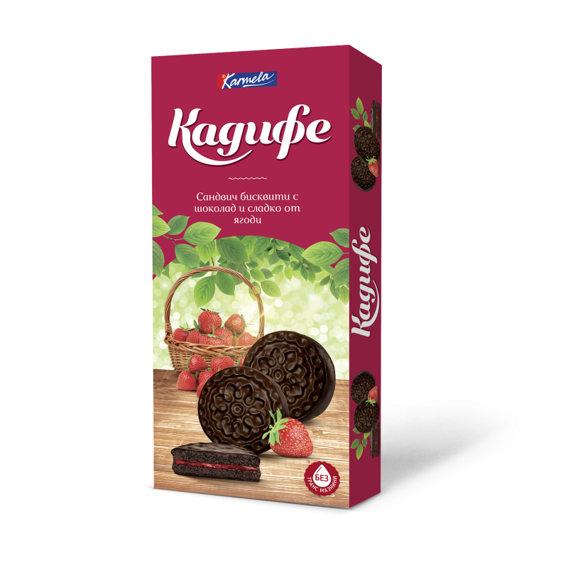 Съдържание:пшеничено брашно,захар,растителна мазнина,нискомалено алкално какао,натурален поколад,набухвател,сол,ароматизант, плодов пълнеж: ягода,глюкозо-фруктозен сироп,захар,желиращ агент,регулатор на киселинност,ароматизант,консервант, какаова глазура:захар,растителна мазнинан,какао на прах,суроватка на прах,ообезмаслено мляко на прах,емулгатори,ароматизант.