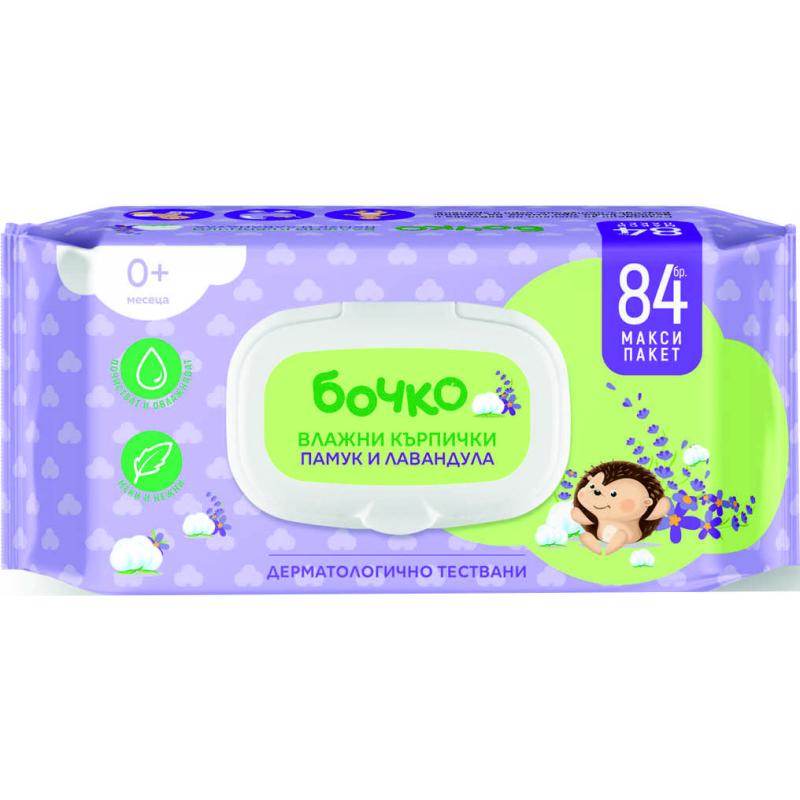 Влажните кърпички Бочко са предназначени за хигиена на бебешка и детска кожа. Идеални при смяна на пелените, при разходка, по време на пътуване, игри и хранене. Подходящи за честа употреба. Напоени с мек лосион на водна основа, с деликатен аромат и с балансирано рН. Без спирт, оцветители и други дразнещи съставки.