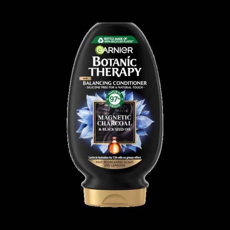 AQUA / WATER, CETEARYL ALCOHOL, GLYCERIN, ISOPROPYL MYRISTATE, STEARAMIDOPROPYL DIMETHYLAMINE, GLYCINE SOJA OIL / SOYBEAN OIL, NIGELLA SATIVA SEED OIL, HELIANTHUS ANNUUS SEED OIL / SUNFLOWER SEED OIL, COCO-CAPRYLATE/CAPRATE, CHARCOAL POWDER, HYDROXYPROPYL GUAR HYDROXYPROPYLTRIMONIUM CHLORIDE, CAPRYLYL GLYCOL, CITRIC ACID, TARTARIC ACID, POLYGLYCERIN-10, POLYGLYCERYL-10 MYRISTATE, POLYGLYCERYL-10 STEARATE, CETYL ESTERS, SODIUM DEHYDROACETATE, BENZOIC ACID, CARAMEL, LINALOOL, LIMONENE, BENZYL ALCOHOL, PARFUM / FRAGRANCE.Garnier Botanic Therapy Magnetic Charcoal е специално разработен за суха коса и бързо омазняващ се скалп. Улеснява разресването и поддържа косата хидратирана, мека и жизнена. Не съдържа силикони и оставя естествено и леко усещане. Веган формулата е обогатена с масло от черен кимион и активен въглен, известен с почистващите си и детоксикиращи свойства. Ефективно отстранява себума, натрупаните токсини и замърсяванията. Продукт с 97% съставки от естествен произход. 100% рециклируема пластмасова бутилка.