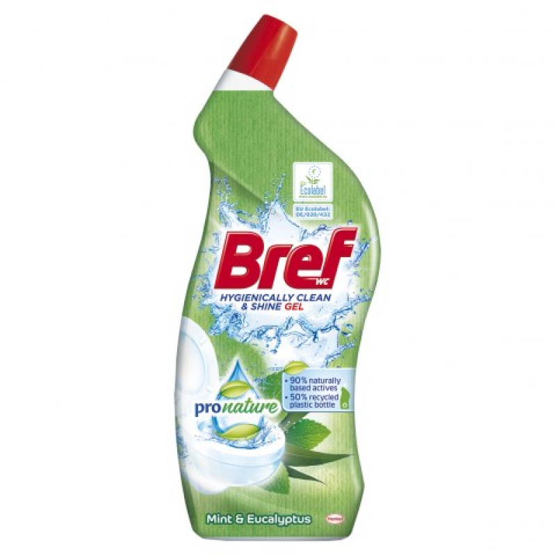 Почистващ препарат за тоалетна Bref Pro Nature е продукт против котлен камък с 90% естествени вещества за активно почистване с аромат на мента и евкалипт, вдъхновен от природата за специална свежест. Бутилката е направена от 50% рециклирана пластмаса. Използване на почистващ препарат за тоалетна Bref ProNature: За да отворите, натиснете едновременно капака от двете страни и завъртете. Нанесете гел за почистване на тоалетни под ръба на тоалетната чиния. Оставете да действа и след това използвайте тоалетната четка. Оставете да действа 30 минути, за да премахнете големи замърсявания и отлагания. Използвайте тоалетна четка, за да отстраните останалата мръсотия. След употреба затворете бутилката, като завъртите капачката, докато щракне. Използвайте само върху тоалетни чинии. Ако тоалетната дъска, подът или чувствителните на киселина повърхности са пръснати, измийте незабавно с много чиста вода, за да предотвратите повреда или обезцветяване