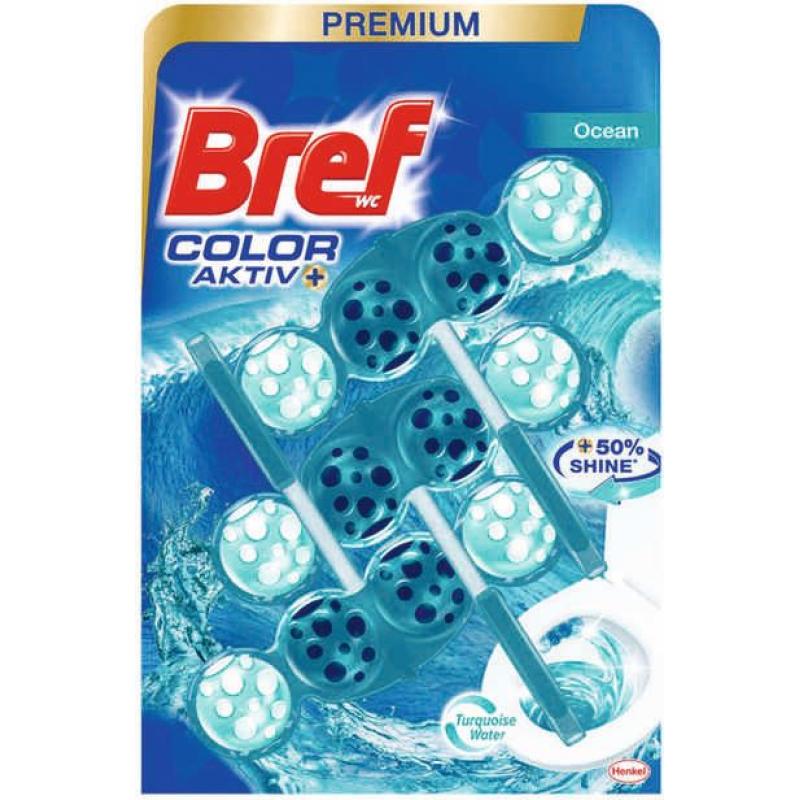 Тяърдо тоалетно блокче Bref цветна вода и 4 действия: 1. Чистота между пусканията на водата благодарение на силата на Синята вода 2. Ефект против варовик 3. Свежест 4. Хигиена. Bref Color Aktiv Ocean 3x50 г с усещане за свеж океански бриз предоставя почистваща пяна, дейстие срещу котлен камък, хигиенизиране и свеж аромат, с всяко пускане на водата. Благодарение на мощното действие, водата в тоалетната е оцветена в тюркоазено и остава тюркоазена.