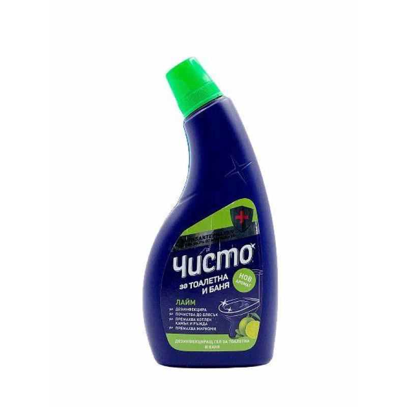 Дезинфекциращият ГЕЛ за тоалетна и баня ЧИСТО ефективно дезинфекцира и почиства всякакъв вид санитарен фаянс: тоалетни чинии, мивки, вани, фуги, батерии, душове и др. Предназначен за дезинфекция и почистване на водоустойчиви повърхности в тоалетни и бани. Концентрираната гел - формула се задържа дори и под вода, премахва петна от ръжда, котлен камък и други упорити замърсявания. Оставя свеж цитрусов аромат.