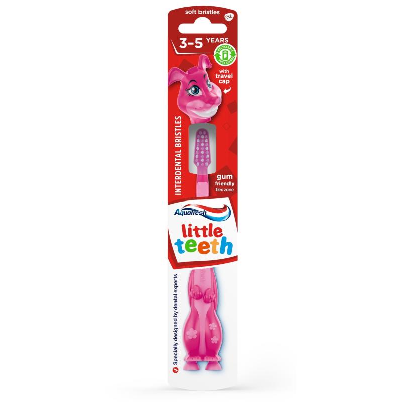 Aquafresh Little Teeth детска четка за зъби 3-6 г е уникална четка за зъби, създадена от стоматолози, с внимание към нуждите на децата в тази възраст. Четката за зъби успешно се справя с премахване на плаката, включително и на захарите, полепнали по детските зъбки. Тя е с меки косъмчета, които да не наранят и без това деликатния емайл. Аквафреш Литъл Тийт детска четка за зъби 3-5 г е създадена за деца, като разновидностите ? са във формата на животни. Дръжката на четката за зъби е удобна за хващане от малките ръчички, като е направена със специални извивки. Така детето по-лесно се учи как да държи четката за зъби и миенето се превръща в игра.