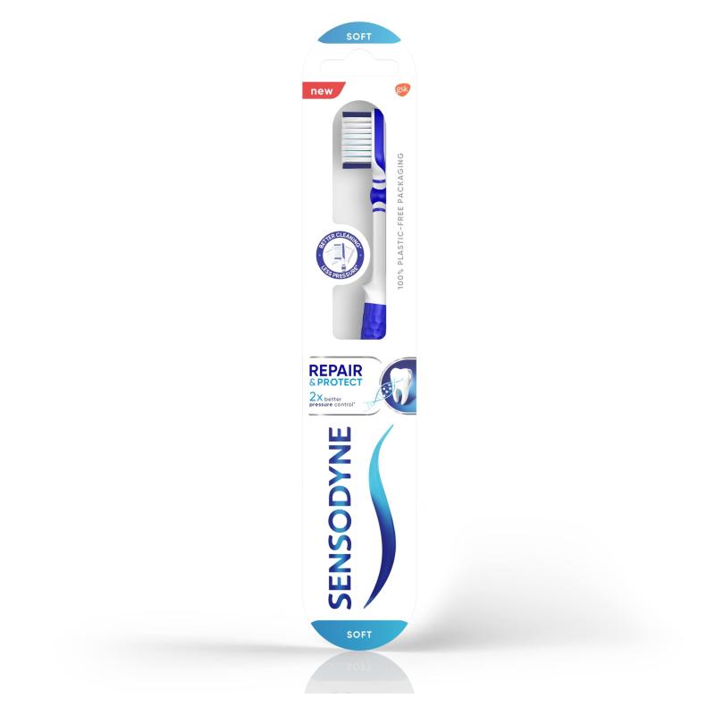 Създадена за хора с чувствителни зъби, четката Сенсодин Рипеър енд Протект, деликатно почиства и защитава зъбите. Тя има влакна, които се огъват при контакт със зъбите и венците и помагат за осигуряването на нежно почистване. Заострените влакна по външната част на четката правят мекия край още по-гъвкав и осигуряват защита срещу прекомерното четкане.