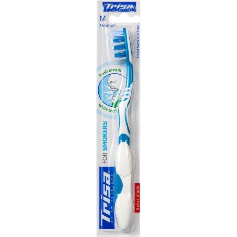 Триза фор Смокърс Медиум Четка за зъби за пушачи осигурява професионално почистване на устната кухина в домашни условия. Специалните активни нишки в снопчетата успяват да неутрализират оцветяванията на зъбите от цигари, кафе и други напитки. Освен това се отличават с нежност и умерена мекота и се отнасят деликатно към венците. Успяват да достигат и почистват отлично междузъбните пространтва, както и плаката от повърхността на зъба.