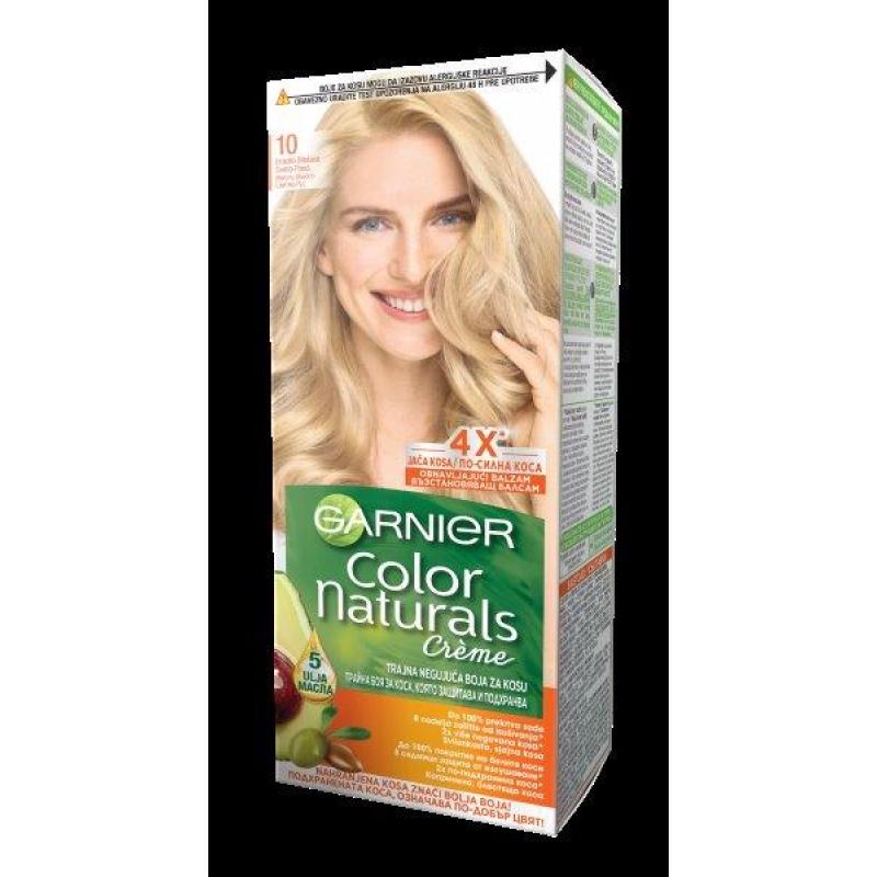 COLORANT CREAM: AQUA / WATER, CETEARYL ALCOHOL, PROPYLENE GLY, HEXADIMETHRINE CHLORIDE, GLYCOL DISTEARATE, POLYQUATERNIUM-6, ETHANOLAMINE, SILICA DIMETHYL SILYLATE [NANO] /SILICA DIMETHYL SILYLATE, CI 77891 / TITANIUM DIOXIDE, m-AMINOPHENOL, ASCORBIC ACID , SODIUM METABISULFITE, OLEA EUROPAEA OIL / OLIVE FRUIT OIL, 2-METHYLRESORCINOL, DIMETHICONE, p-PHENYLENEDIAMINE, CARBOMER, RESORCINOL, EDTA, PARFUM / FRAGRANCE. (F.I.L. C201370/1). 1152439 - DEVELOPER: AQUA / WATER, HYDROGEN PEROXIDE, CETEARYL ALCOHOL, SODIUM SALICYLATE, TRIDECETH-2 CARBOXAMIDE MEA, PHOSPHORIC ACID, CETEARETH-25, TETRASODIUM ETIDRONATE, TETRASODIUM PYROPHOSPHATE, GLYCERIN. (F.I.L. C202318/1). 1051655 N - CONDITIONER: AQUA / WATER, CETEARYL ALCOHOL, BEHENTRIMONIUM CHLORIDE, PEG-180, CETYL ESTERS, OLEA EUROPAEA FRUIT OIL / OLIVE FRUIT OIL, BUTYROSPERMUM PARKII BUTTER / SHEA BUTTER, GLYCINE SOJA OIL / SOYBEAN OIL, TRIDECETH-6, AMODIMETHICONE, RIBES NIGRUM SEED OIL / BLACK CURRANT SEED OIL, ISOPROPYL ALCOHOL, HYDROXYETHYLCELLULOSE, CITRIC ACID, PERSEA GRATISSIMA OIL / AVOCADO OIL, TOCOPHEROL, PHENOXYETHANOL, CHLORHEXIDINE DIGLUCONATE, CETRIMONIUM CHLORIDE, LINALOOL, BENZYL ALCOHOL, PARFUM / FRAGRANCE. (F.I.L. C227818/2). Активни съставки: 3 подхранващи масла - маслина, авокадо, карите. Масла от маслина, авокадо, карите - защитават и подхранват косъма от корена до върха.Garnier Color Naturals Creme 10 е подхранваща крем-боя за коса, която покрива на 100% белите коси, и ги дарява с дълготраен, интензивен и блестящ цвят.