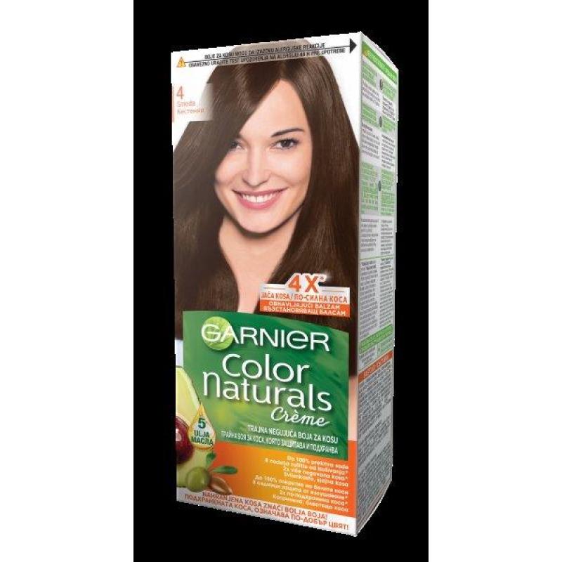 Масла от маслина, авокадо, карите - защитават и подхранват косъма от корена до върха.Garnier Color Naturals Creme 4 е подхранваща крем-боя за коса, която покрива на 100% белите коси, и ги дарява с дълготраен, интензивен и блестящ цвят.