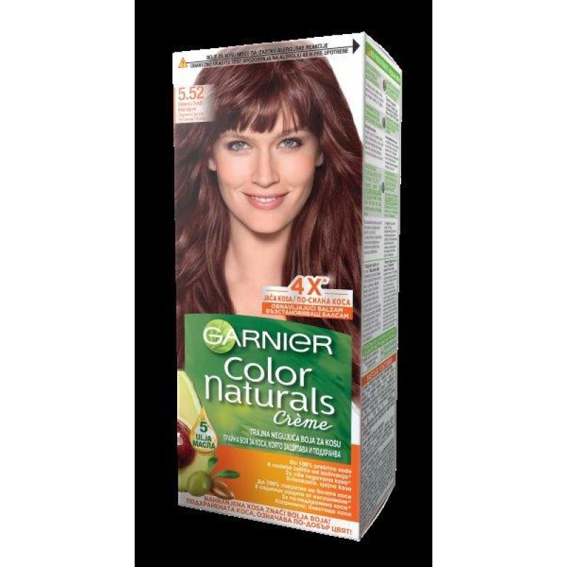 Масла от маслина, авокадо, карите - защитават и подхранват косъма от корена до върха.Garnier Color Naturals Creme 5.52 е подхранваща крем-боя за коса, която покрива на 100% белите коси, и ги дарява с дълготраен, интензивен и блестящ цвят.