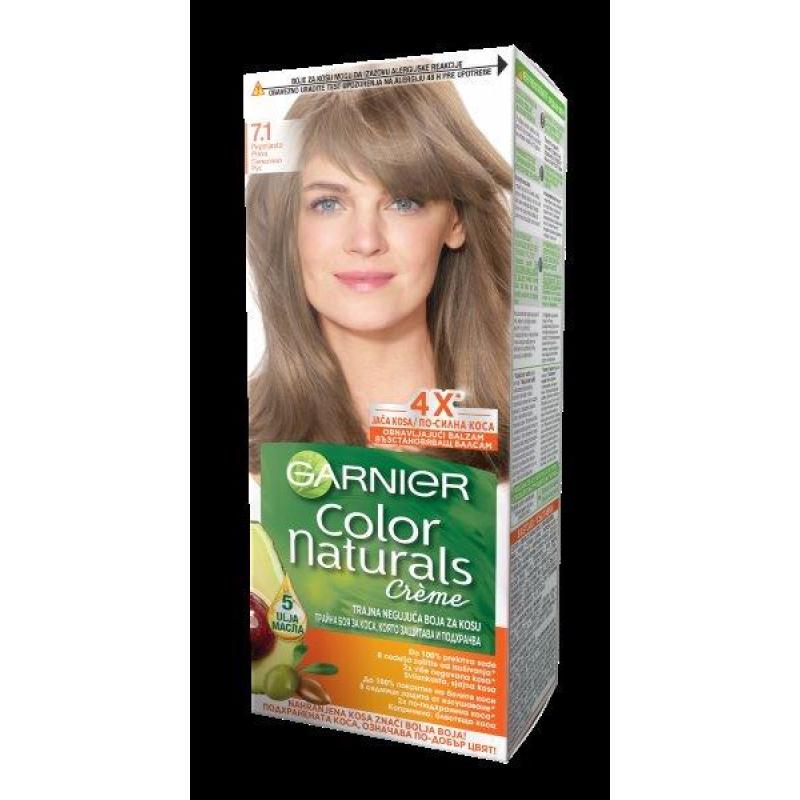 Масла от маслина, авокадо, карите - защитават и подхранват косъма от корена до върха.Garnier Color Naturals Creme 7.1 е подхранваща крем-боя за коса, която покрива на 100% белите коси, и ги дарява с дълготраен, интензивен и блестящ цвят.