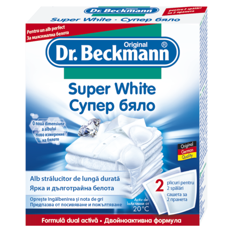 Супер бяло Д-р Бекман премахва посивяването и връща ослепителната белота на Вашето пране, дори и след като бъде изпрано пак.Подходящ и като добавка към всеки прах за пране и всякакви температури на пране над 20 °C (по-висока температура ще даде по-добри резултати). подходящ и за бели дрехи с цветни компоненти.