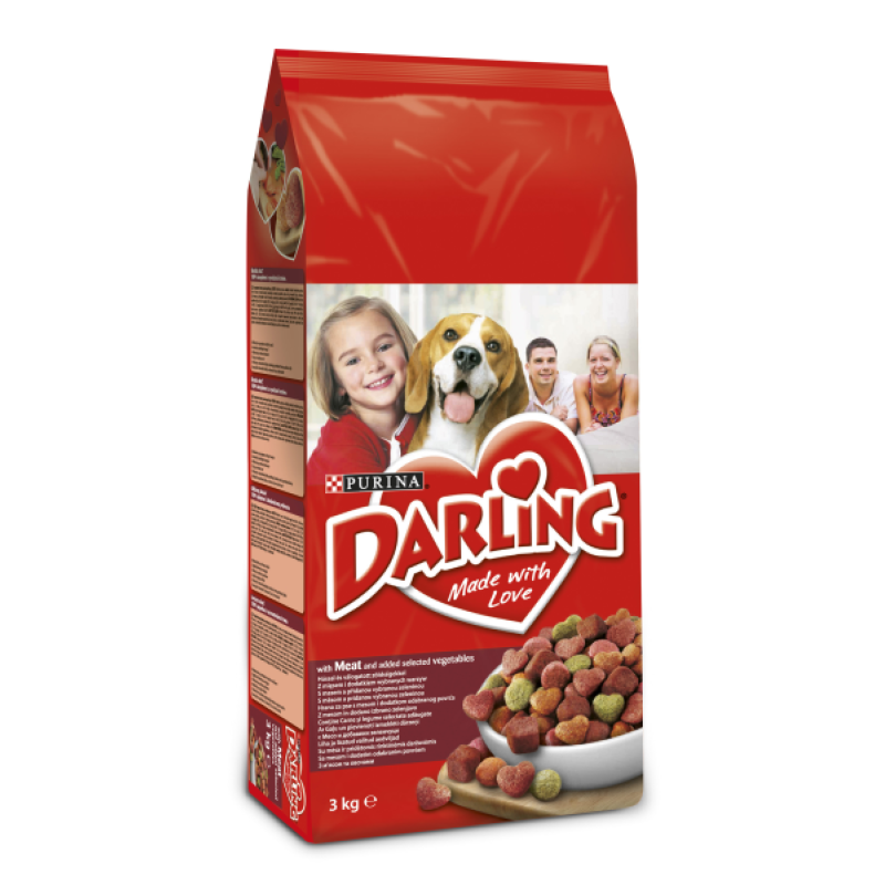 PURINA® Darling®, рецепти, направени с любов специално за Вашето куче! Всяка вкусна рецепта е направена с внимателно подбрани съставки и е 100% пълноценна и балансирана, с витамини и минерали, за да осигури всички хранителни съставки, от които се нуждае Вашето куче.