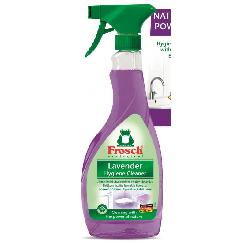 Препарат Frosch Lavender Hygiene-Cleaner е универсално почистващо средство, предназначено за почистване на замърсени повърхности в банята и тоалетната и отстраняване на варовик. Уникалната формула на продукта съдържа екстракти от лавандула, благодарение на което, тя елиминира биологичните отпадъци, подпомага оптималното отстраняване на замърсяванията, остатъци от сапун, водни петна и варовик. Препаратът отстранява ефективно неприятните замърсявания и миризми, препаратът предоставя отлични резултати и оставя приятен свеж аромат на лавандула.