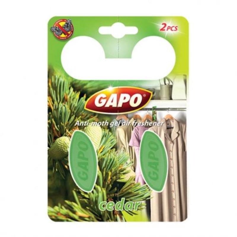 Състав: кумарин, цинеол, (2E)-2-(фенилметилиден)октанал, 3,7-диметилоктан-3-ол, линалоол, 2-метилундеканал, пин-2(3)-ен, транс-p-ментан-3-он, еугенол, метил цинамат.Естетсвена защита срещу миризмиНе оставя следни по дрехите.Удобна закачалкаGAPO Гел ароматизатор за молци с аромат на кедъросигурява естествена защита срещу миризми, като освежава тъканите с приятен и дискретен аромат. Не оставя следи по дрехите.