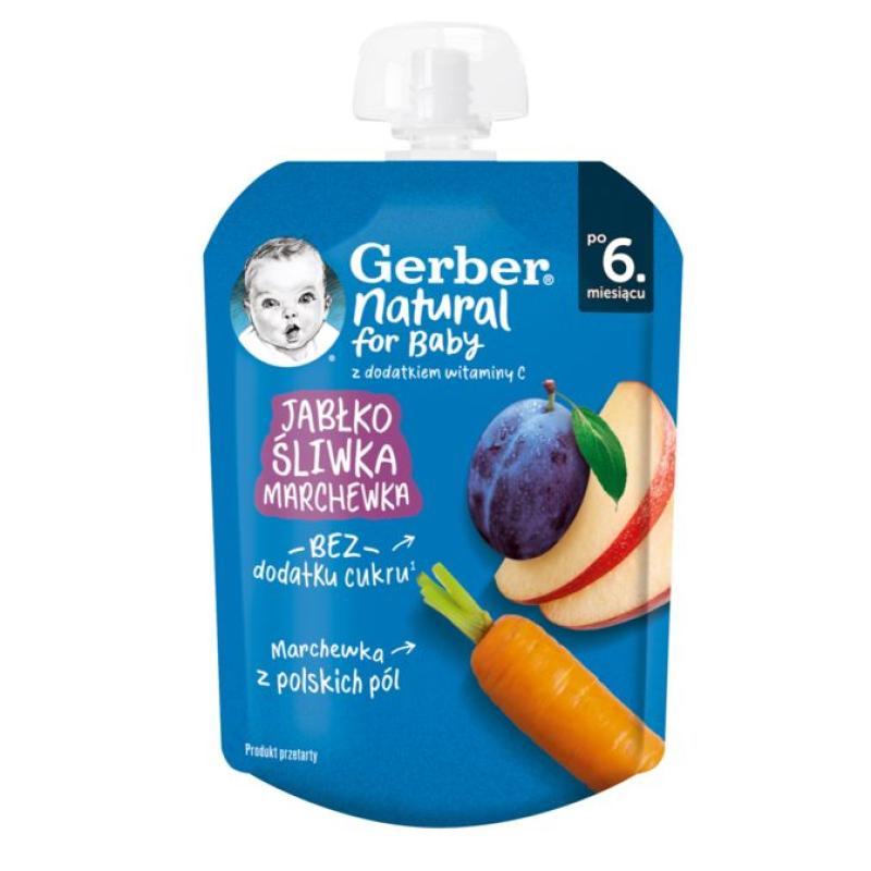 Съставки: ябълки (70%), сливи (20%), моркови (10%), Витамин C.Продуктът Плодова закуска Gerber® предлага иновативен формат на опаковката наречен ПАУЧ. Готова за употреба, този тип опаковка позволява лесно да се консумира по време на път, разходка в парка или на плаж. Продуктът Плодова закуска Gerber® предлага иновативен формат на опаковката наречен ПАУЧ. Готова за употреба, този тип опаковка позволява лесно да се консумира по време на път, разходка в парка или на плажа. Плодовият десерт Gerber® Ябълка, слива и морков е пълноценна закуска от 100% плодове с нежна текстура. Разнообразете сутрешното или следобедното меню на своето дете с вкусна и удобна за консумация плодова закуска на Gerber® във пауч формат. Продуктът е с натурален вкус на вложените в него съставки. Съдържа 70 % ябълки, 20 % сливи, 10%, моркови и Витамин C. НЕ СЪДЪРЖА ГЛУТЕН.