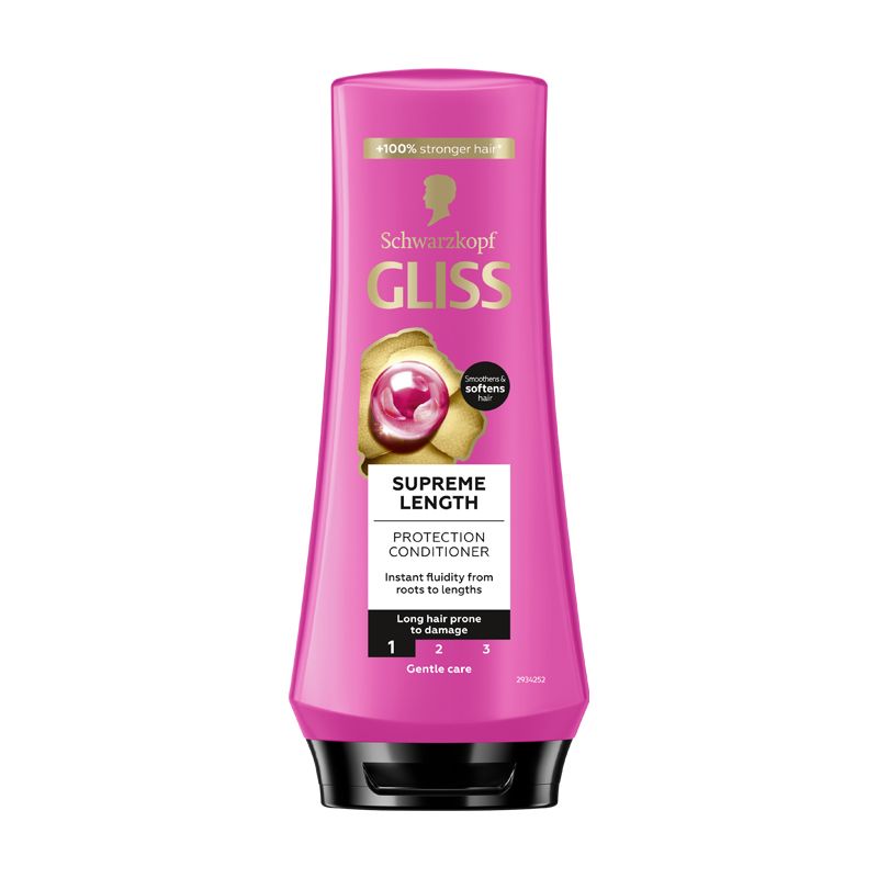 Gliss Supreme Length Conditioner е висококачествен балсам за дълга коса, който възстановява повредените участъци по дължините на косата, заглажда я и намалява накъсването на краищата. Формулата съдържа биотинов комплекс и екстракт от божур, които дълбоко подхранват и хидратират косата. Божурът стимулира растежа и намалява пърхота, възстановява косата и ? придава блясък. Биотинът подсилва структурата на косъма и му придава копринена мекота. Вложен е и кератин, който заздравява косата и я предпазва от бъдещи увреждания и масло от кайсиеви ядки, което я прави силна и блестяща. Глис Сюприйм Лент Балсам за дълга коса омекотява косата и я прави лесна за разресване. При редовна употреба, тя е гладка, еластична и сияйна от корените до върховете. Дерматологично тестван продукт.