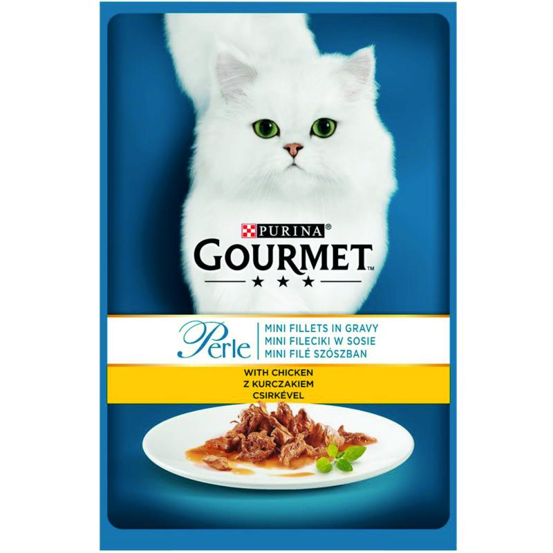 Gourmet Perle предлага елегантна гама от нежни рецепти, които да галят сетивата на Вашата котка с неустоим вкус всеки ден. Фини филенца от месо или риба, внимателно приготвени в оригинални и иновативни рецепти. Изкушение, пред което Вашата котка с удоволствие ще се предаде. Съставки: Месо и месни субпродукти (от които Пиле 4%), екстракт от зеленчукови протеини, риба и рибни субпродукти, минерали, захари. Добавки: Хранителни добавки: IU/kg: Vit A: 650; Vit D3: 99 mg/kg: Железен сулфат монохидрат: 23; Калциев йодат анхидрид: 0.29; Меден сулфат пентахидрат: 2.5; Манганов сулфат монохидрат: 4.4; Цинков сулфат монохидрат: 37. Аналитични съставки: Влага: 80%; Протеини: 12.5%; Съдържание на мазнини: 2.5%; Сурова пепел: 2.5%; Хранителни влакнини: 0.05%.