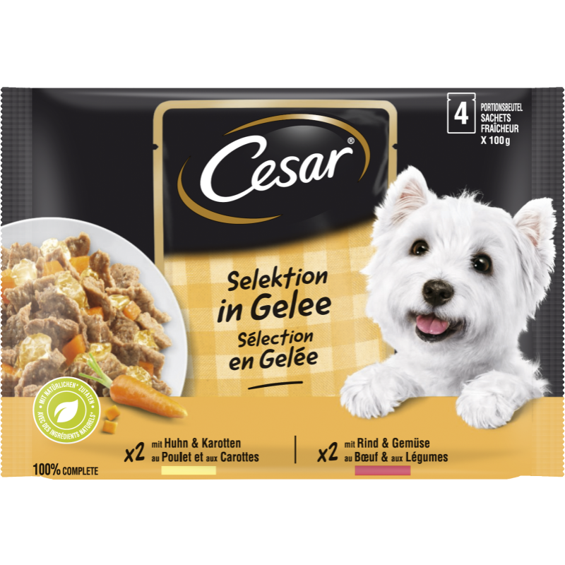 Съдържание: Месо и животински производни /45% включително или 4% пиле, или 4% телешко, зависи от съответниявкус пауч в опаковката/, зеленчуци /включително 4% моркови или 4% микс от грах и мовкови, зависи от съотвветния вкус пауч в опаковката/, минерали, деривати от растителен произход.