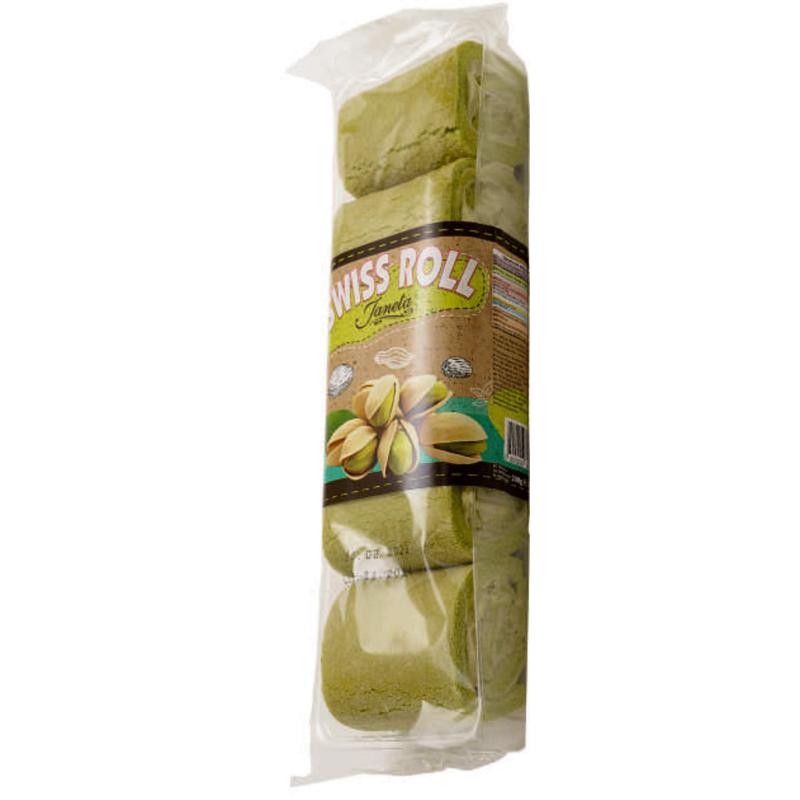 Съдържание:пшеничено брашно,захар,пастьоризиран яйчен меланж,рафинирано слънчогледово масло,набухвател,оцветител,консерввант,крем пистачо 40%захар,вода,растителнамазнинан,регулатор на киселиността,печено малцово брашно,нискомаслено какао на прах,арматизант,оцветител.