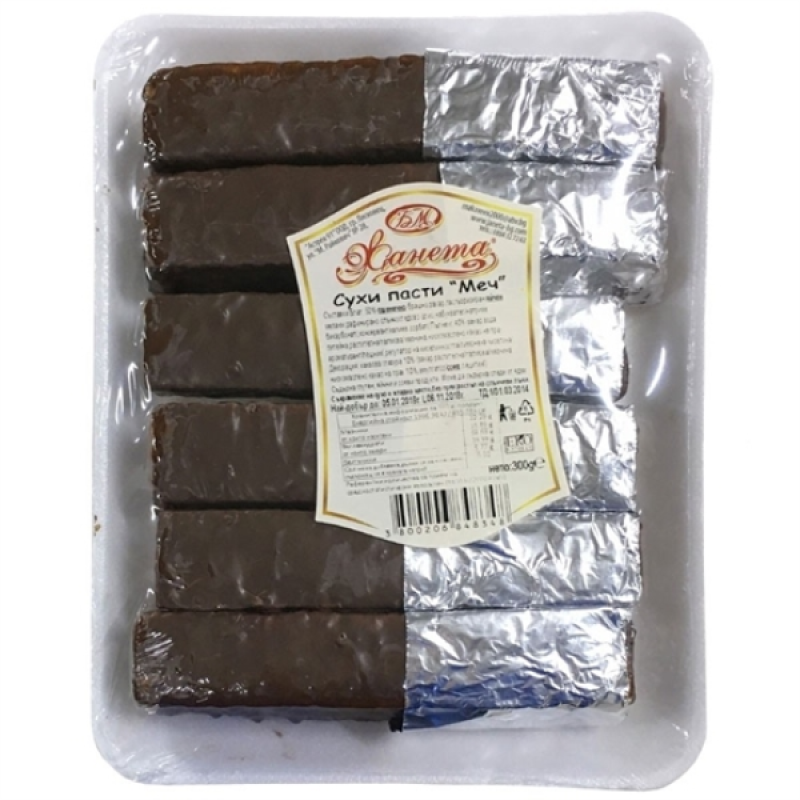 Съставки: Блат 50% (пшенично брашно, захар, пастьоризиран яйче меланж, пчелен мед 5%, рафинирано слънчогледово масло, набухвател(натриев бикарбонат), консервант(калиев сорбат). Пълнеж 40% (захар, вода, растителна палмова мазнина, нискомаслено какао на прах, ароматизант (лешник), регулатор на киселинност(лимонена киселина), консервант(калиев сорбат)).Декорация 10% какаова глазура (захар, растителна палмова мазнина, нискомаслено какао на прах 10%, емулгатор(соев лецитин)).