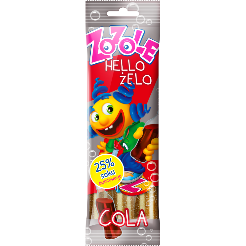 Желирано бонбони с вкус на кола супер кисели. Състав - захар,глюкозо-фруктозен сироп,ябълков сок от концентрат , пшенично нишесте ,пшенично брашно ,киселини - лимонена ,млечна ,ябълчена .