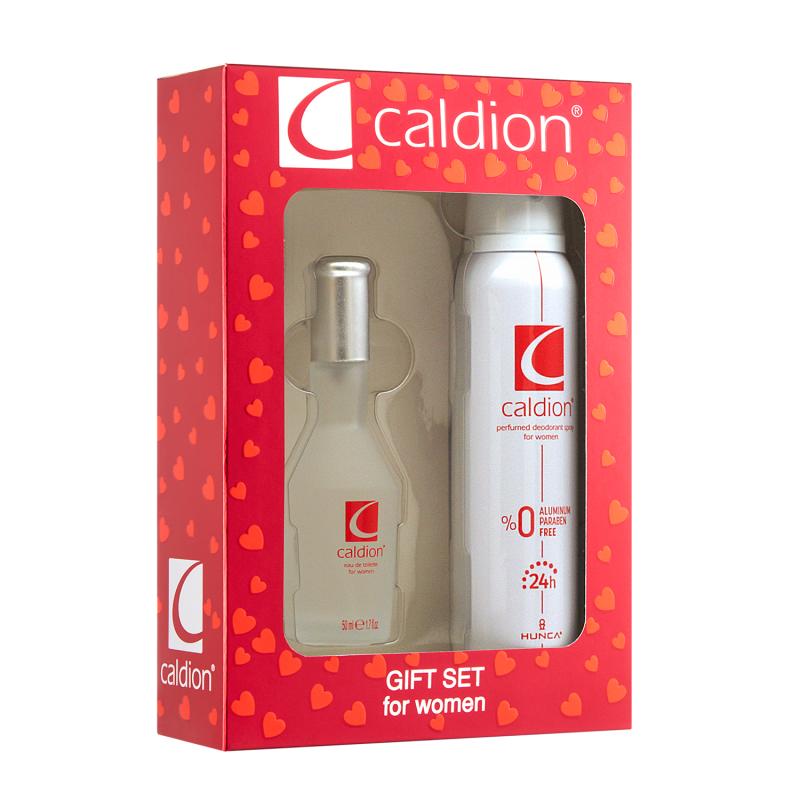 Комплектът на Калдион за жени съдържа Тоалетна вода 50 мл и Дезодорант 150 мл. Тоалетната вода притежава неустоим флорален и плодов аромат. Връхните нотки съчетават комбинация от ванилия, сандалово дърво и амбра, а средните от жасмин и люляк. Изключително подходяща формула за класическите жени, които искат да подчертаят елегантността и красотата си. Дезодорант ефикасно попива в кожата и дрехите и осигурява дълготраен свеж аромат. Същевременно подчертава женствеността и доставя чувство на комфорт и увереност.