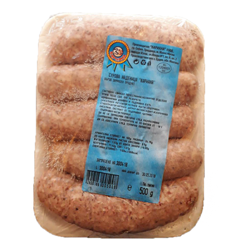 Съставки: свинско месо, сланина, механично отделено птиче месо, сол, лук резенчета, комбинирани добавки и подправки 0.4%, (киселинен регулатор: натриев ацетат, подправки, антиоксидант: аскорбинова киселина, стабилизатор: натриев цитрат), екстракт от подправки ЦЕЛИНА, чесън, чубрица. Хранителна стойност за 100g продукт:енергийна стойност 1109 kJ/268 kcal; мазнини 24.15g, от които наситени мастни киселини 8.9g; въглехидрати 1.23g, от които захари 0.09g; белтъци 11.42g; сол 1.27g