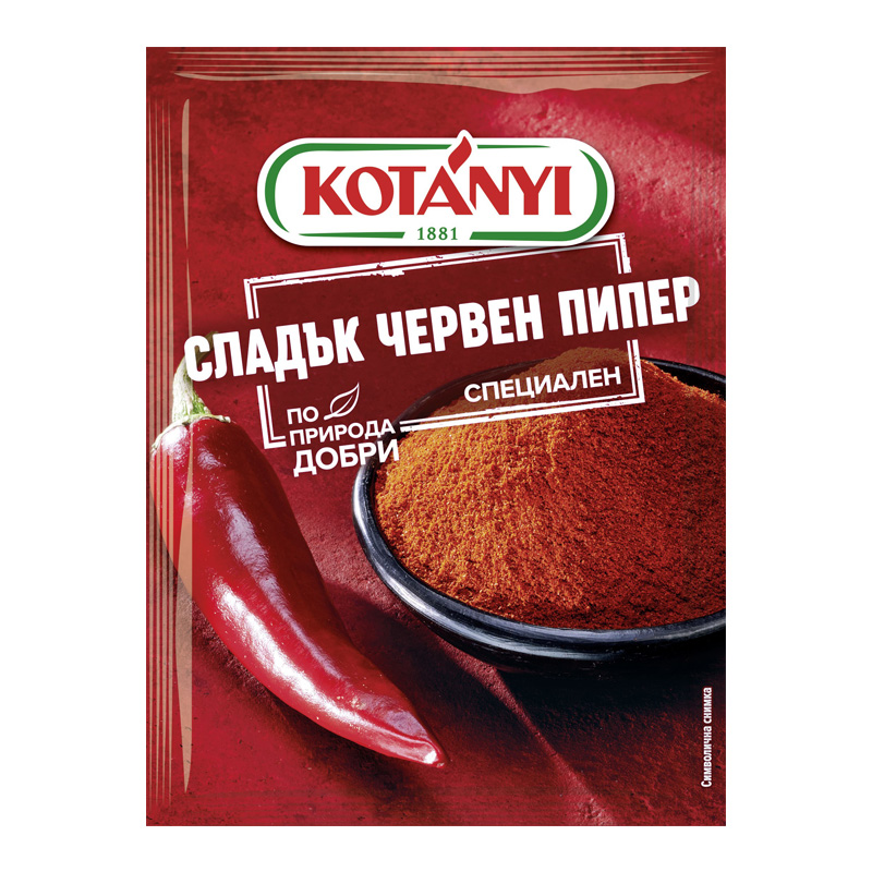Сладък червен пипер Kotanyi е произведен от подбрани червени чушки, които се изсушават и обработват по специална технология. По този начин се извличат най-добрите качества на червените чушки и се създава прекрасен червен пипер с наситен цвят, богат аромат и приятен вкус.