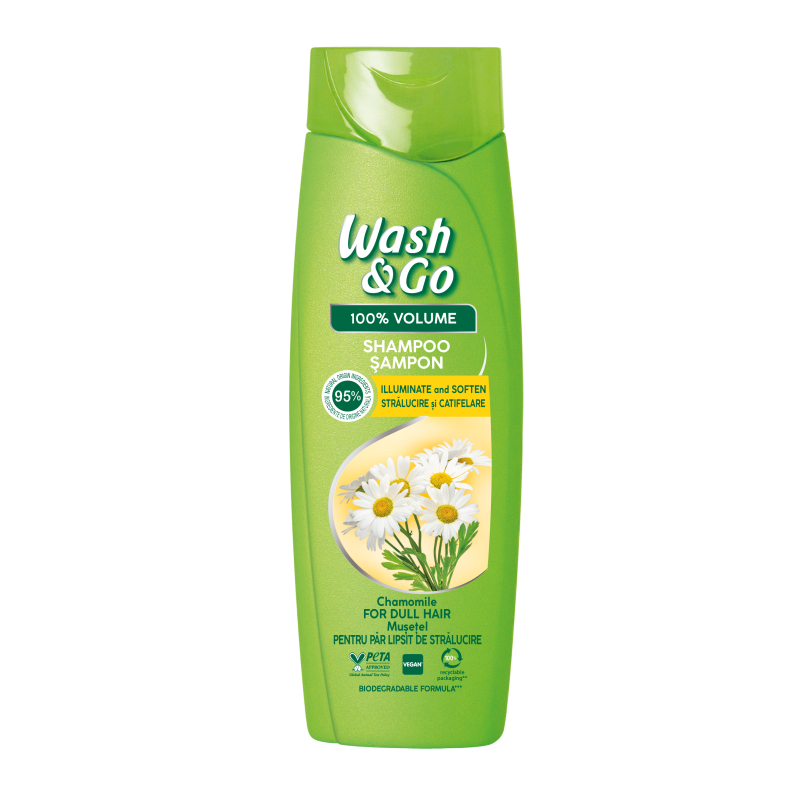 Състав: AQUA, SODIUM LAURETH SULFATE, SODIUM LAURYL SULFATE, GLYCOL, DISTEARATE, COCAMIDOPROPYL BETAINE, SODIUM CITRATE, COCAMIDE MEA, SODIUM XYLENESULFONATE, DIMETHICONE, ZINC PYRITHIONE, CITRIC ACID, SODIUM BENZOATE, HIDROKSIPROPILTRIMONIUM CHLORIDE, PERFUME, SODIUM CHLORIDE, GLYCERIN, LINALOOL, BUTYLPHENYL METHYLPROPIONAL, HEXYL CINNAMIC, BENZYL SALICYLATE, CITRONELLOL, LEMON, METILIZOTIAZOLINON, SODIUM, POLINAFTALENSULFONAT, MAGNESIUM NITRATE, METILHLOROIZOTIAZOLINON, MAGNESIUM CHLORIDE.Wash & Go Shampoo with Chamomile Extract e шампоан за блясък и обем с екстракт от лайка. Подходящ за безжизнена коса. Специалната формула съдържа екстракт от лайка спомага възстановяването на косъма и освен това повлиява благоприятно върху кожата на главата. Уош & Гоу Шампоан за блясък и обем с екстракт от лайка заглажда повърхността на косъма, която отразява светлината и прави косата видимо по-сияйна, копринено мека и изпълнена с обем. Съдържа 95% натурални съставки