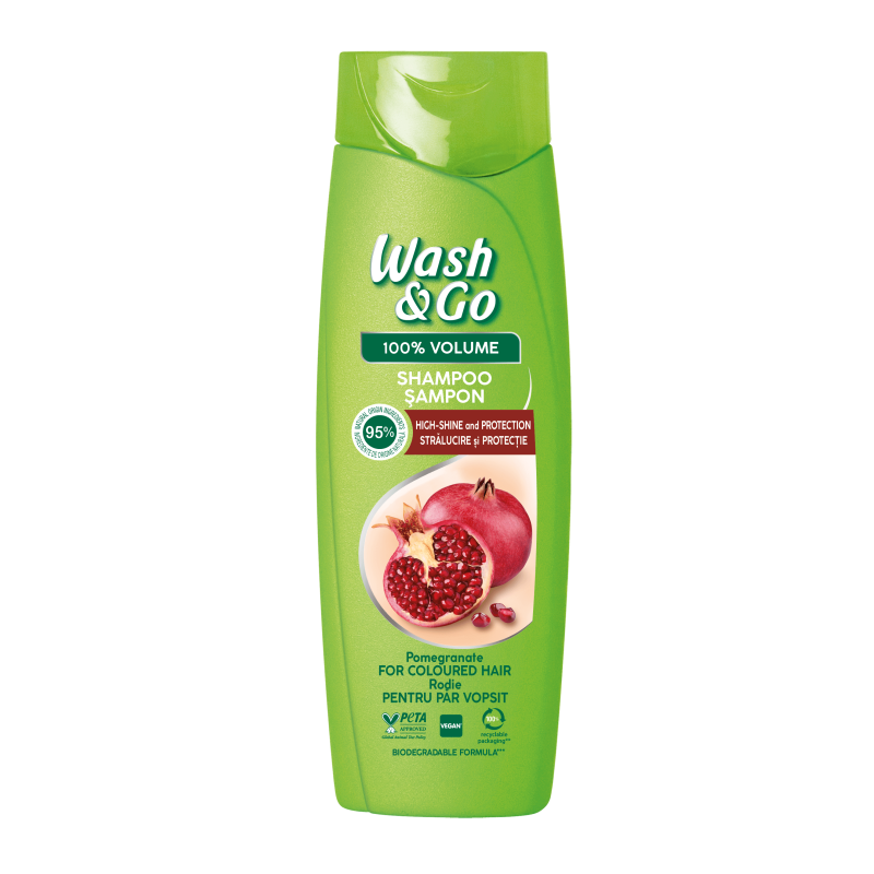 Състав: AQUA, SODIUM LAURETH SULFATE, SODIUM LAURYL SULFATE, GLYCOL, DISTEARATE, COCAMIDOPROPYL BETAINE, SODIUM CITRATE, COCAMIDE MEA, SODIUM XYLENESULFONATE, DIMETHICONE, ZINC PYRITHIONE, CITRIC ACID, SODIUM BENZOATE, HIDROKSIPROPIL TRIMONIUM CHLORIDE, PERFUME, SODIUM CHLORIDE, GLYCERIN, LINALOOL, BUTYLPHENYL METHYLPROPIONAL, HEXYL CINNAMIC, BENZYL SALICYLATE, CITRONELLOL, LEMON, METILISOTIAZOLINONA, SODIUM, POLI NAFTALEN SULFONAT, MAGNESIUM NITRATE, METILHLOROIZOTIAZOLINON, MAGNESIUM CHLORIDE.Wash & Go Shampoo with Pomegranate Extract е шампоан за боядисана коса с екстракт от нар, който осигурява нужната хидратация и подхранваща грижа. Формулата е създадена да поддържа цвета ? и едновременно с това да я поддържа чиста и свежа. Добавеният екстракт от нар предпазва цвета от избледняване, засилва неговата интензивност и го поддържа сияен за дълго. Уош & Гоу Шампоан за боядисана коса с екстракт от нар придава на косата красив обем и я прави лесна за оформяне. Съдържа 95% натурални съставки.