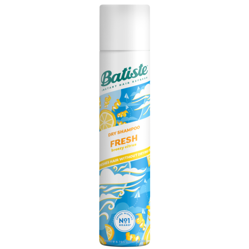 Състав:BUTANE, ISOBUTANE, PROPANE, ORYZA SATIVA (RICE) STARCH, ALCOHOL DENAT, PARFUM (FRAGRANCE), CETRIMONIUM CHLORIDE, DISTEARYLDIMONIUM CHLORIDE, BENZYL SALICYLATE, HYDDROXYCITRONELLAL, LIMONENE, LINALOOL.Сухият шампоан за коса FRESH от Batiste ефективно премахва неприятното омазняване от корените и освежава косата, без да създава усещане за сухота. С ароматни нотки на на свежи лимони, мандарини и портокали. Удължете времетраенето между две измивания на косата и я дарете с добавена плътност и обем.