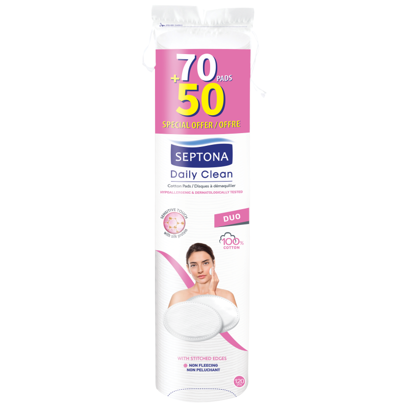 Septona Daily Clean са памучни тампони за нежно почистване на лицето. Те са изработени от 100% памук, микробиологично тестван за вашата безупречна хигиена. Тампоните са двустранни - гладката страна нежно премахва грима от лицето ви, а релефната почиства в дълбочина. Те съдържат копринени протеини, които защитават кожата. Краят на всеки тампон разполага с обвивка, която не позволява оставането на влакна и разслояване.