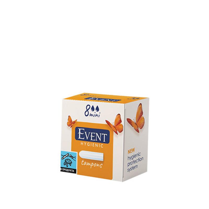 Дамските тампони Евент Мини са предназначени за жени и девойки със слаба менструация. Изработени са от естествени влакна с висока хигроскопичност. Имат 8 каналчета за по-бързо абсорбиране на течността. С нежно заоблен връх за лесно поставяне и отстраняване. Гладка повърхност, благодарение на фината покривна капсула на тампона, което не позволява попадането на власинки в тялото и осигурява компактност и стабилност дори при отстраняването на тампона. Осигуряват комфорт и надеждна защита.