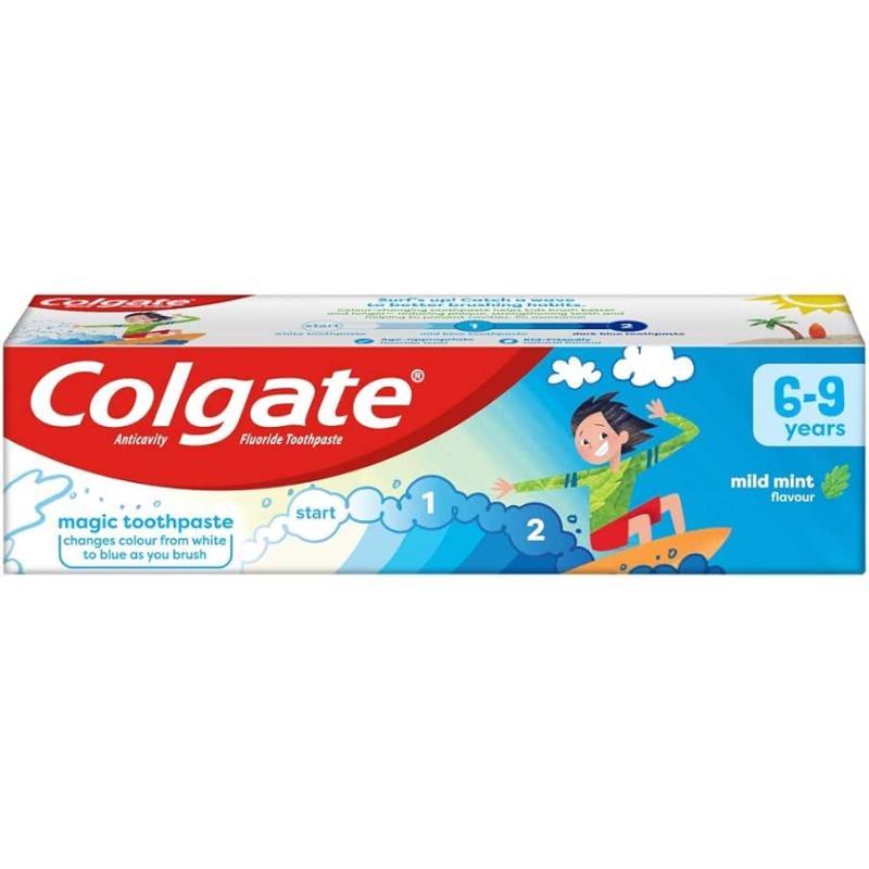 Colgate детска паста за зъби 6-9г 50 мл е продукт, специално създаден за деца от 6 до 9 години. Пастата е с нежна формула, защитаваща и подхранваща детските зъби. Освен това, детската паста за зъби прави дъха свеж и има страхотен плодов вкус. Употребата на плодове в съдържанието провокира детското любопитство към регулярното почистване на зъбите.