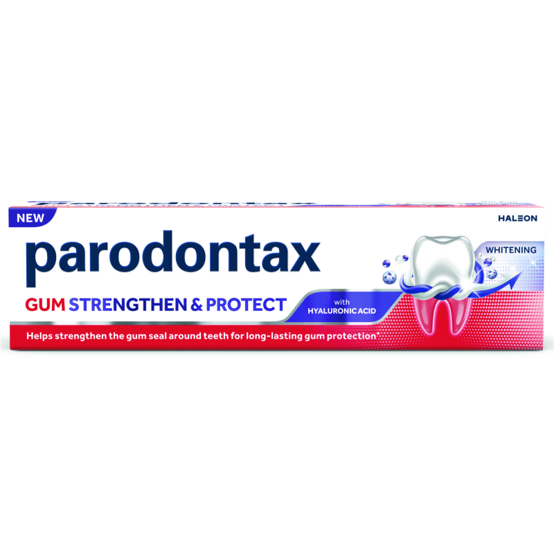 Пастата за зъби Gum Strengthen & Protect White на paradontax с иновативна формула е създадена с цел да осигури оптимална защита на Вашата усмивка. Тя съдържа активни съставки IPMP и цинк, които играят ключова роля в контролирането на натрупването на плака и притежават антимикробни свойства, намаляващи бактериалната активност. Цинкът се отличава с освежаващо действие, което помага за улавяне и елиминиране на лошия дъх. Пастата е допълнително обогатена с хиалуронова киселина, която е важен елемент за поддържане на здрави венци и осигурява необходимата хидратация.
