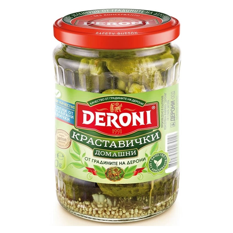 Съставки: краставички 52%, питейна вода, оцет, захар, сол, пресен чесън, подправки - копър, синап, черен пипер.