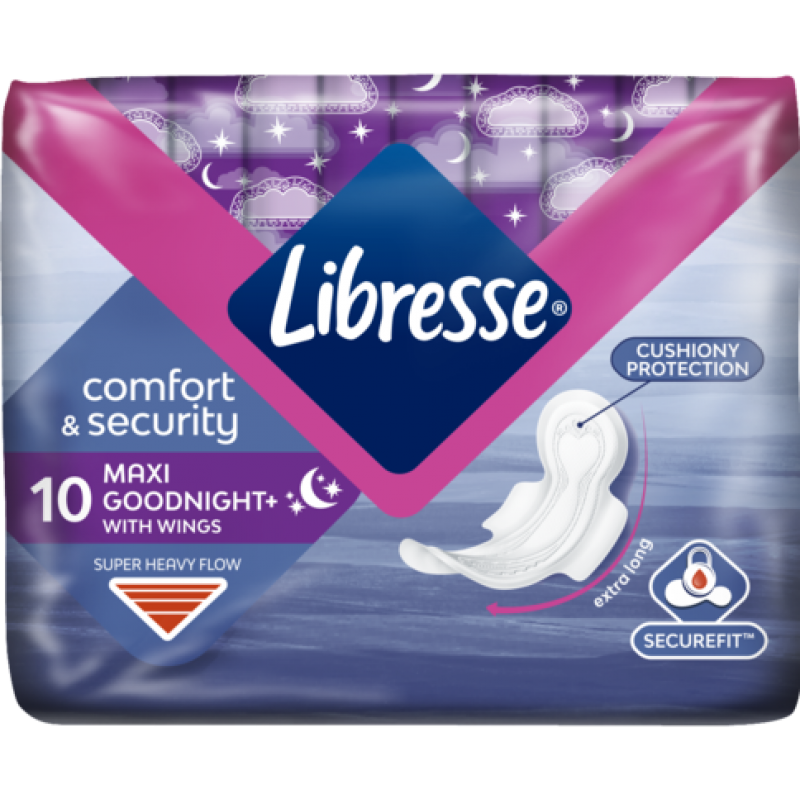 Libresse Maxi Wing goodnight са супер абсорбиращи дамски превръзки. Предлагат сигурна защита през нощта, както и в дните с тежък и обилен менструален цикъл. Специалната SecureFit технология осигурява плътно прилягане към извивките на тялото, така че да разчитате на сигурна защита срещу протичане. Специалните каналчета за бързо отвеждане на течностите към ядрото, както и дишащият горен слой на превръзката създават незаменимо усещане за комфорт и свежест.