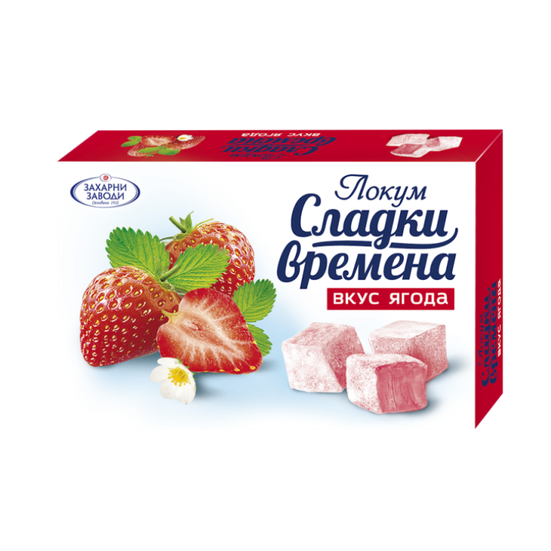 Съставки: захар, сироп от глюкоза, вода, пшенично нишесте, ароматизант: ягода 0.16%, оцветител: кармини, регулатор на киселинност: лимонена киселина. Може да съдържа следи от ядки и стафиди.